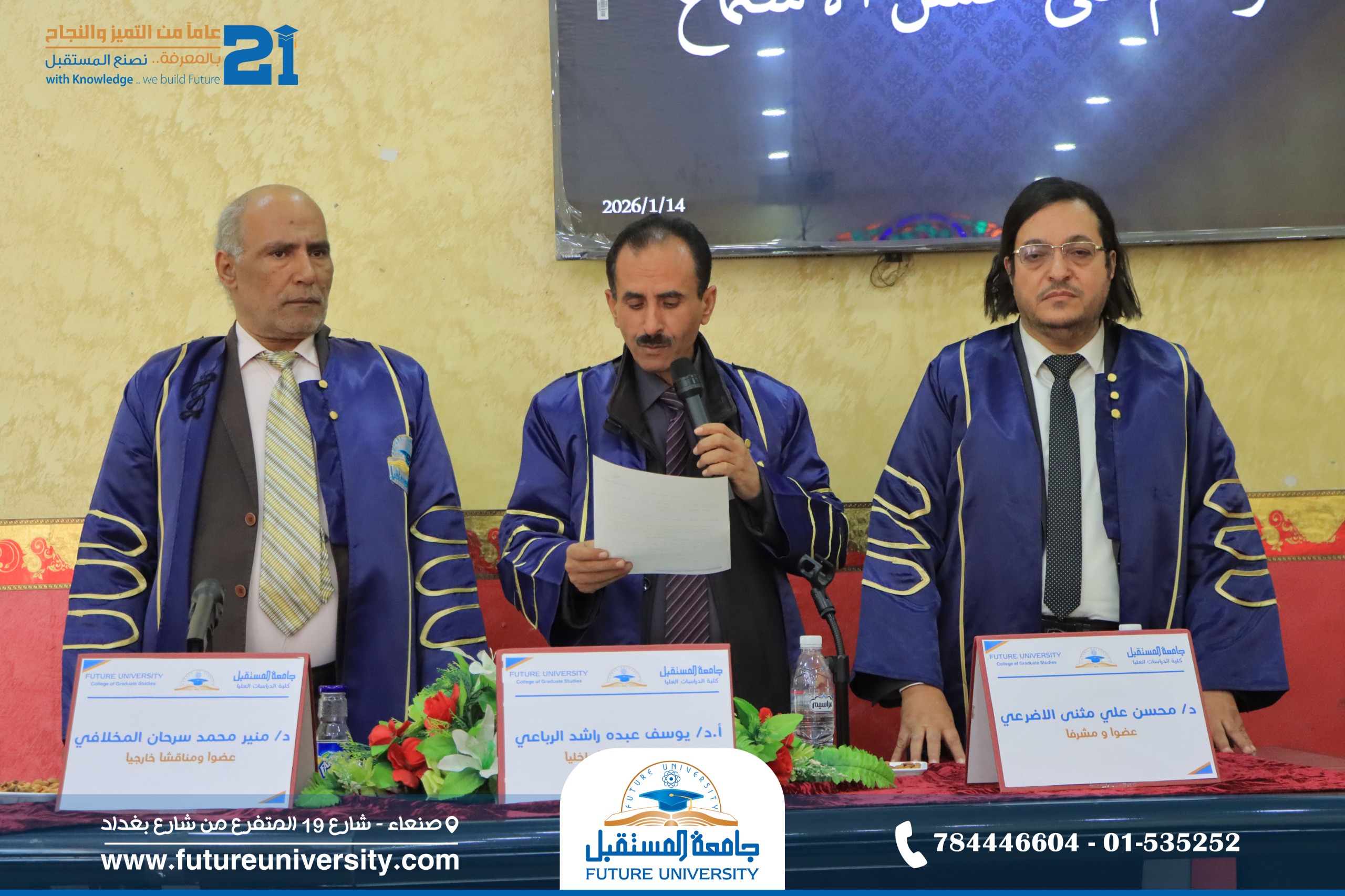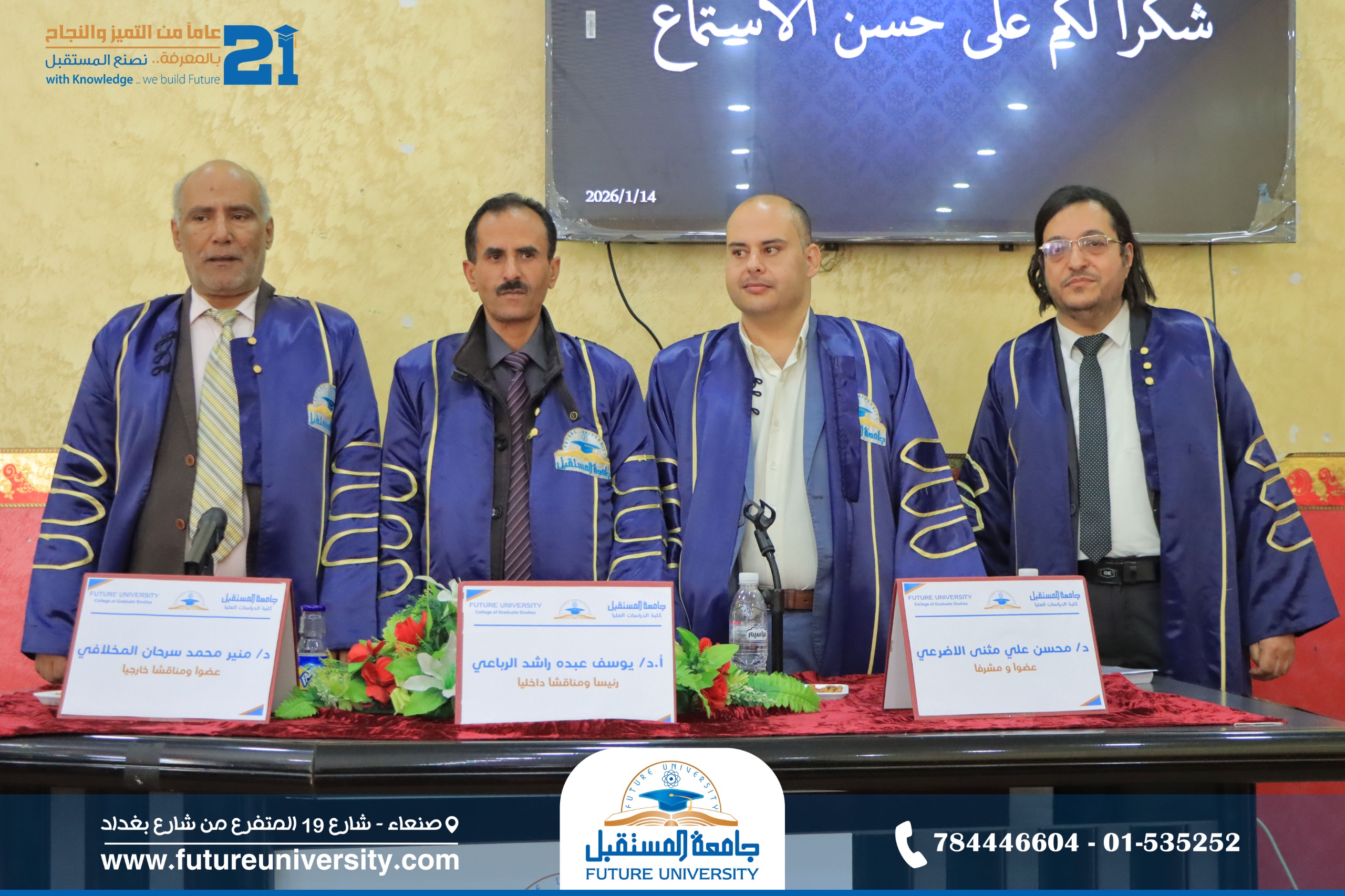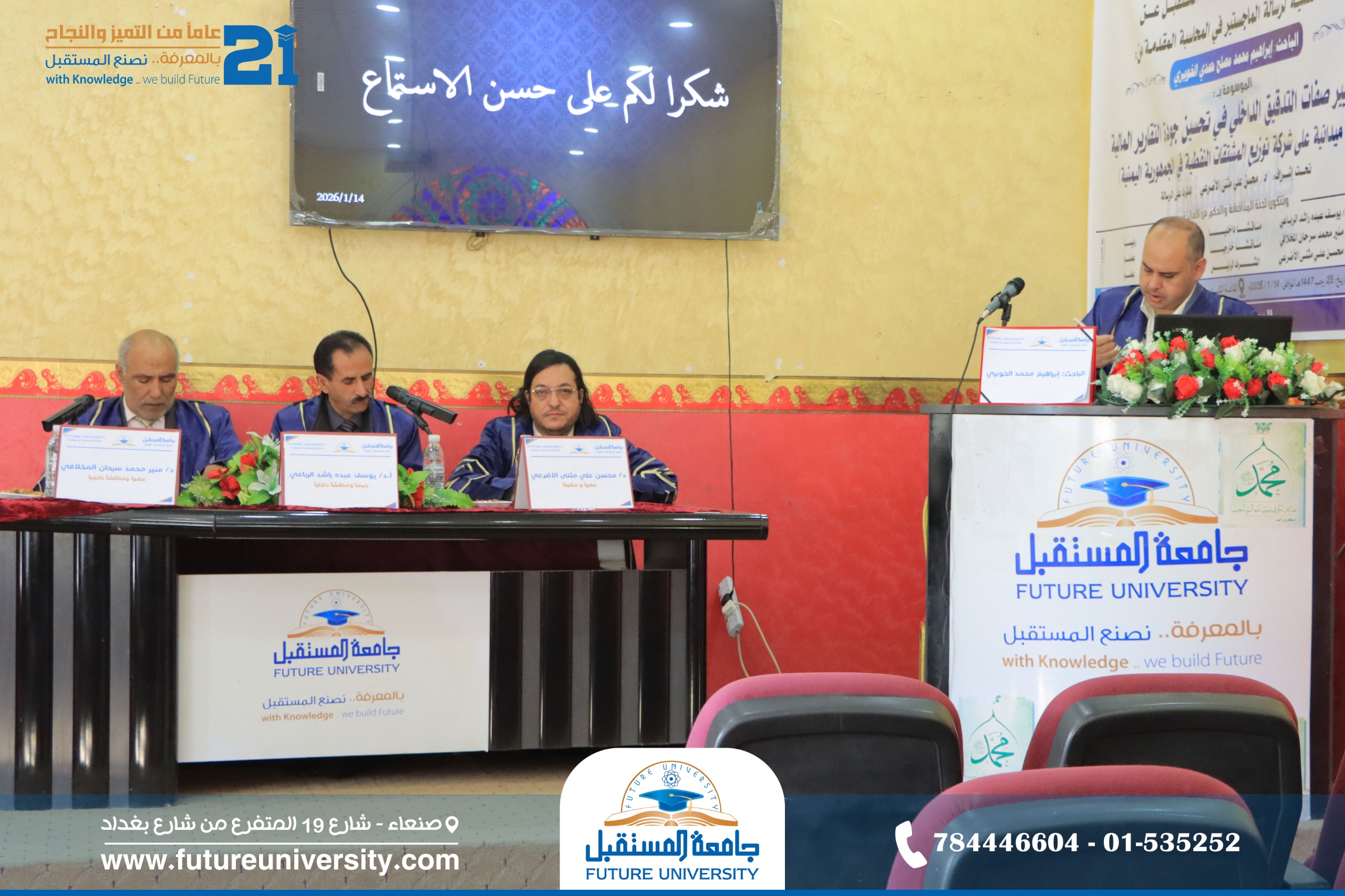 أُقيمت صباح اليوم الأربعاء، 25 رجب 1447هـ، الموافق 14 يناير 2026م، بجامعة المستقبل، المناقشة العلنية لرسالة الماجستير المقدمة من الباحث/ إبراهيم محمد مصلح حمدي الخوبري، والموسومة بعنوان: