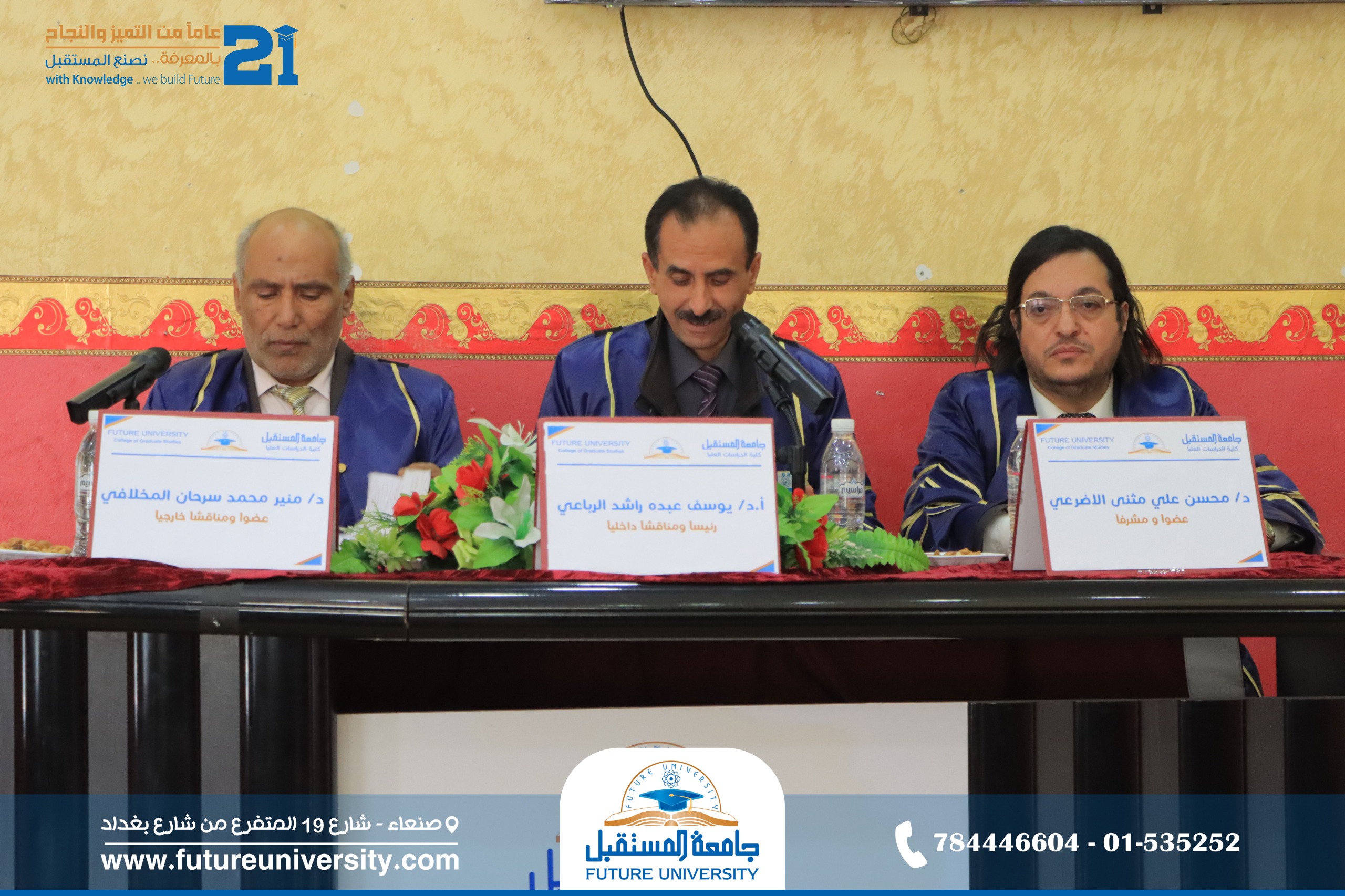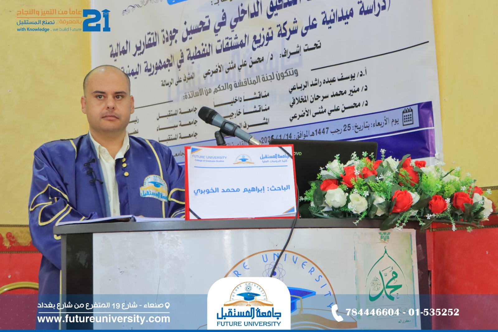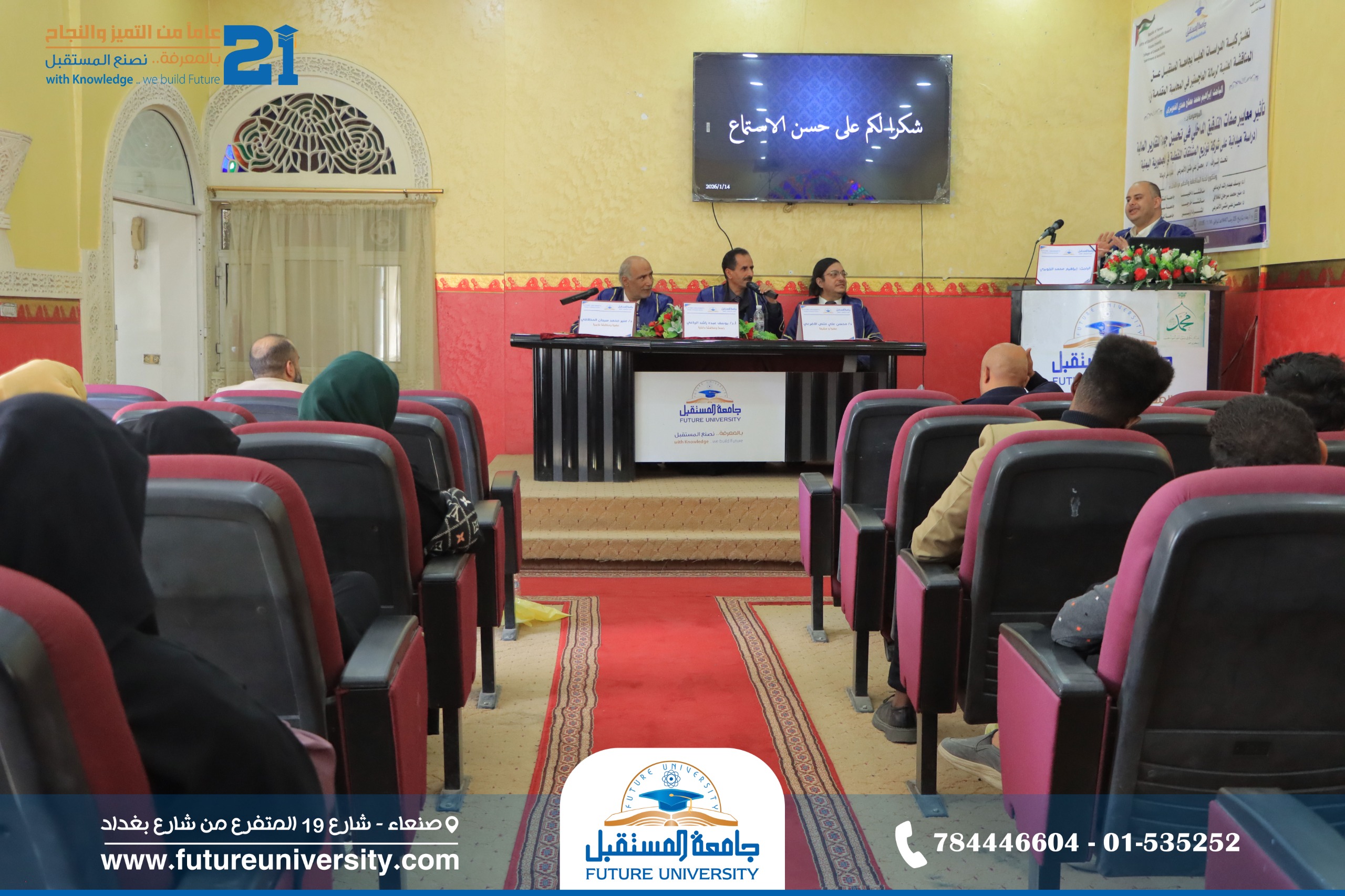 أُقيمت صباح اليوم الأربعاء، 25 رجب 1447هـ، الموافق 14 يناير 2026م، بجامعة المستقبل، المناقشة العلنية لرسالة الماجستير المقدمة من الباحث/ إبراهيم محمد مصلح حمدي الخوبري، والموسومة بعنوان: