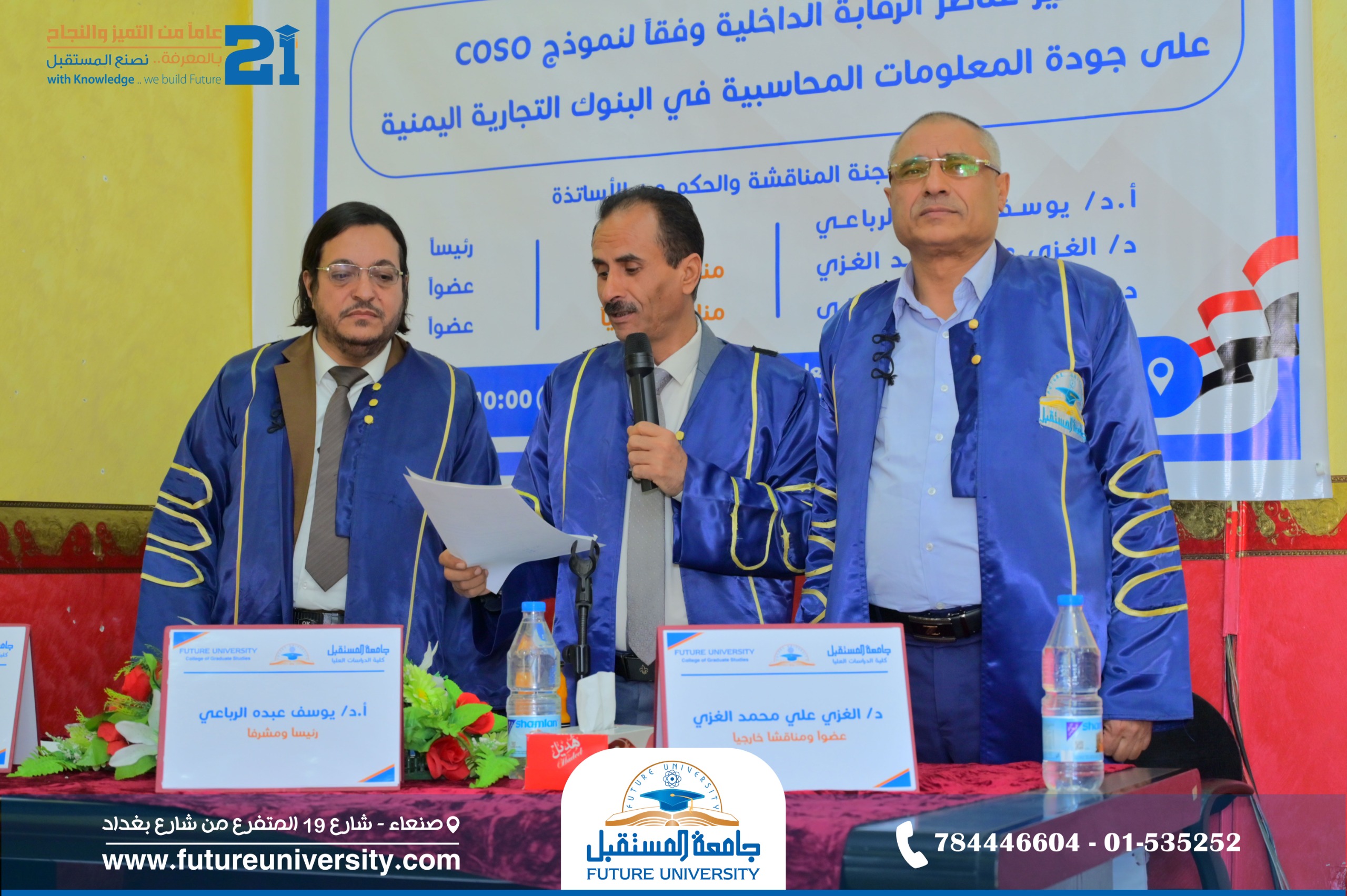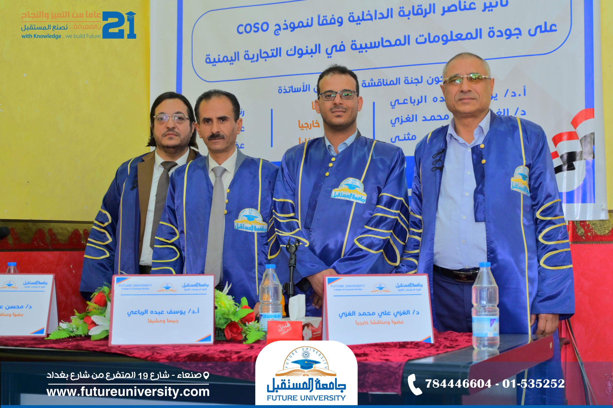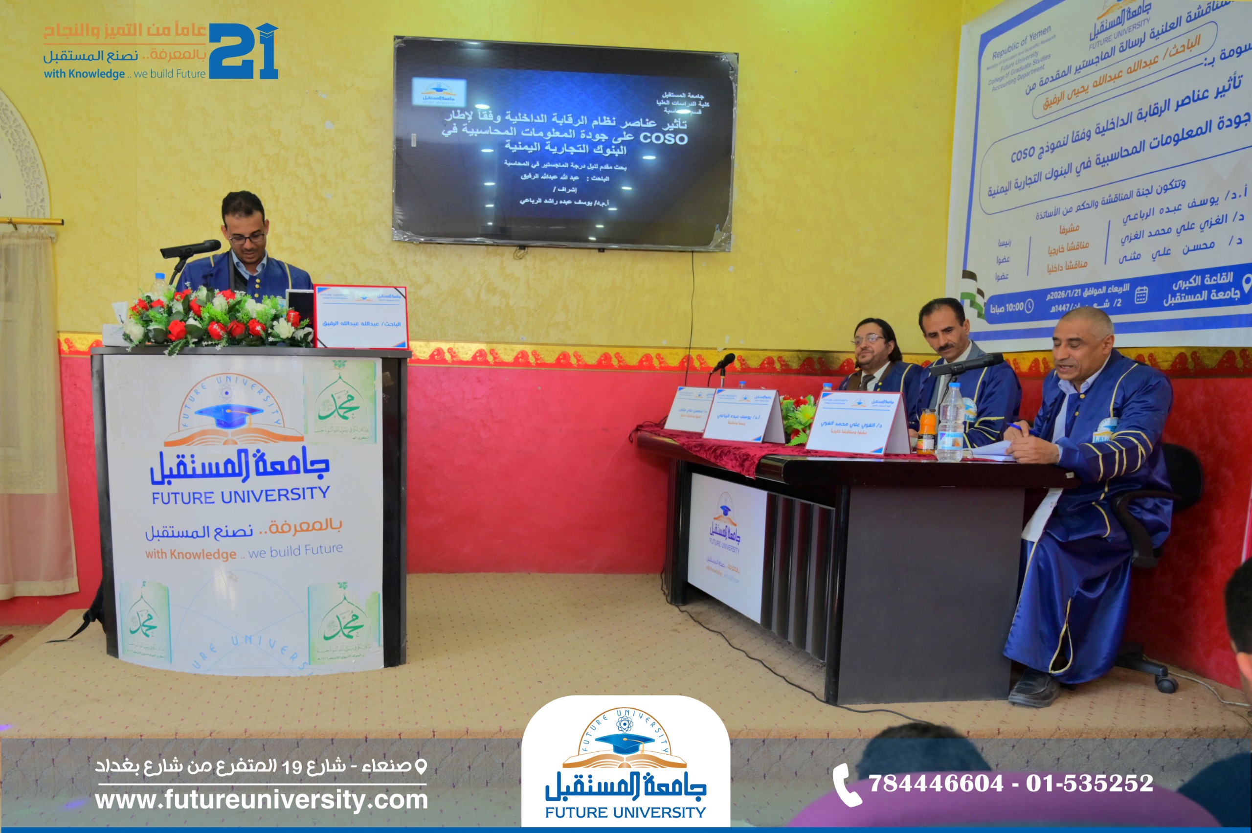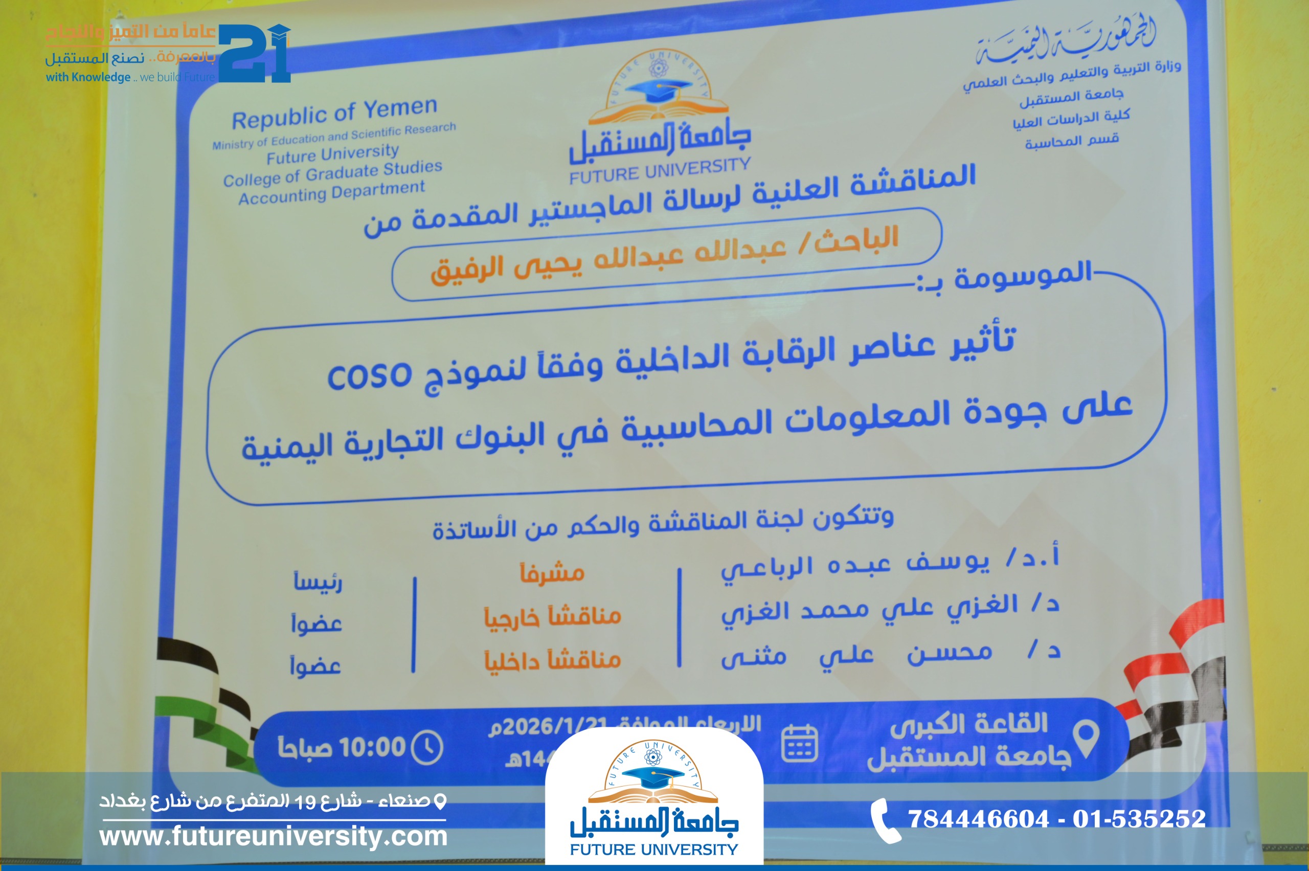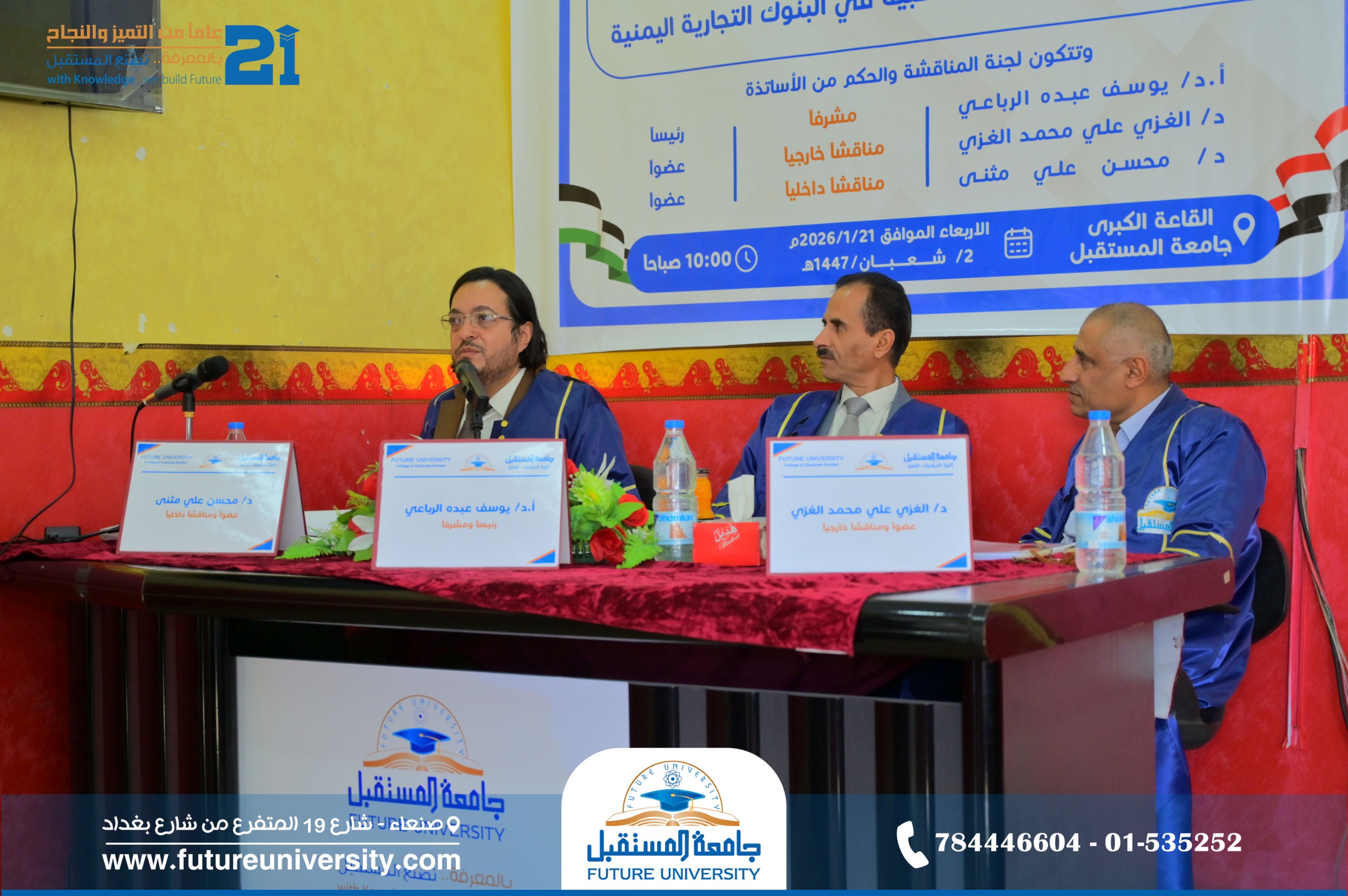 أُقيمت صباح اليوم الأربعاء، 2 شعبان 1447هـ، الموافق 21 يناير 2026م، بجامعة المستقبل، المناقشة العلنية لرسالة الماجستير المقدمة من الباحث/ عبدالله عبداللّٰه يحيى الرفيق، والموسومة بعنوان: